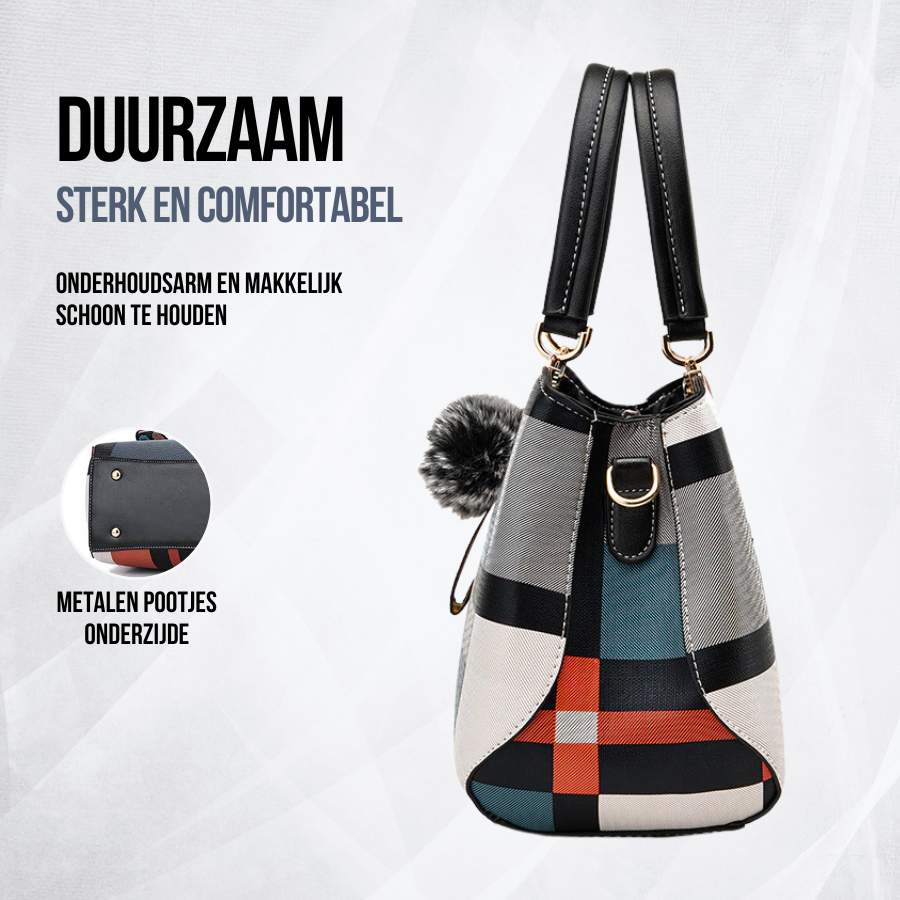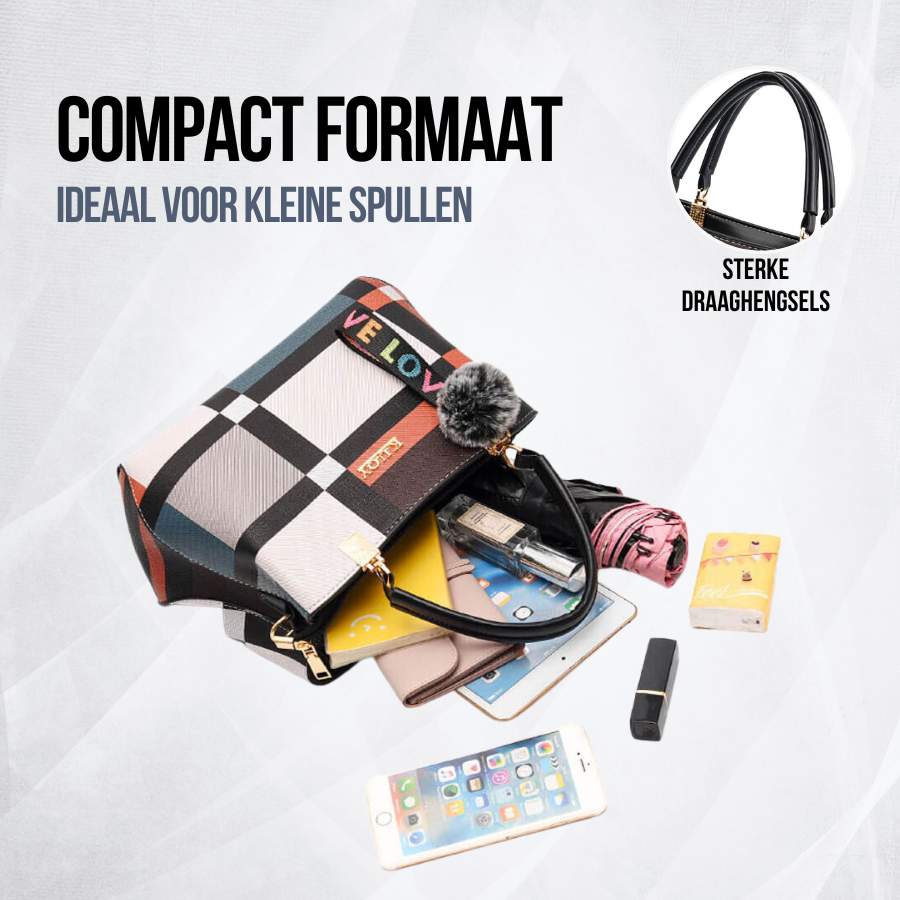 Stijlvolle en compacte schoudertas; dankzij de goudkleurige details heeft de tas een luxe uitstraling. Ideaal voor dagelijks gebruik of als werk, school of avondtas. Verkrijgbaar in de kleuren patchwork zwart, bruin en beige.