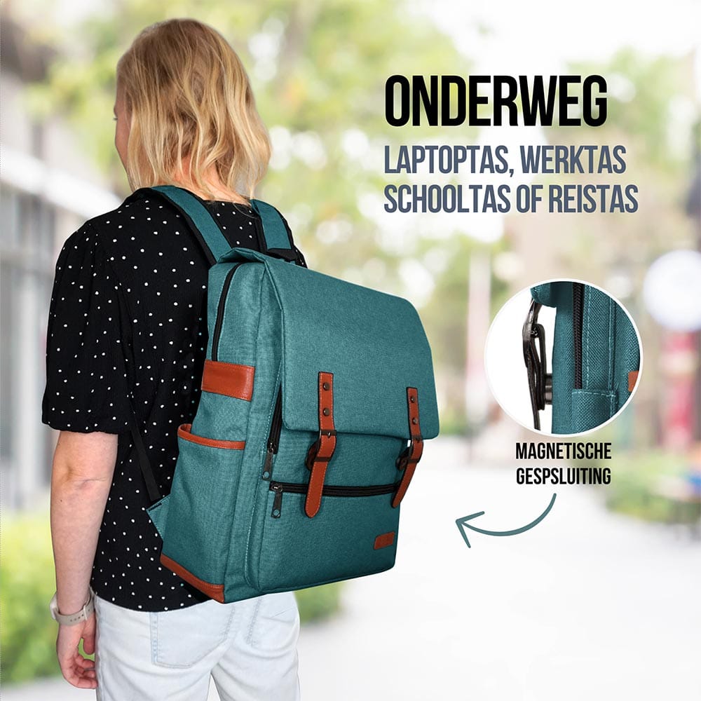 Door de vele opbergmogelijkheden is deze tas uitermate geschikt als 17 inch laptoptas, school- of boekentas, reistas of werktas. Verkrijgbaar in de kleuren groen (mint), zwart en petrol.